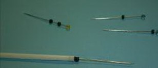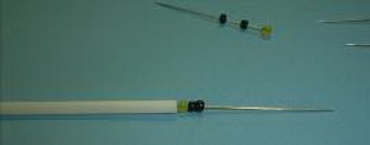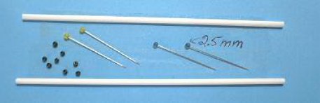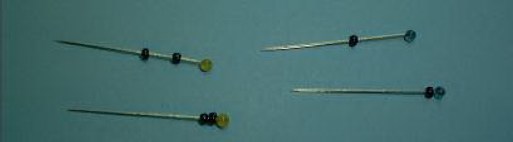 Put some glue on the end of the straw and insert the pins into the straw to about half of the depth of the first black seed bead. Do this on both ends of both straws making sure that you have the double beads on the same straw. When the glue is dry cut off the ends of the pins with wire snips. Cut close to the beads on the double beaded straw and Leave a little on both ends of the straw with the single seed beads.